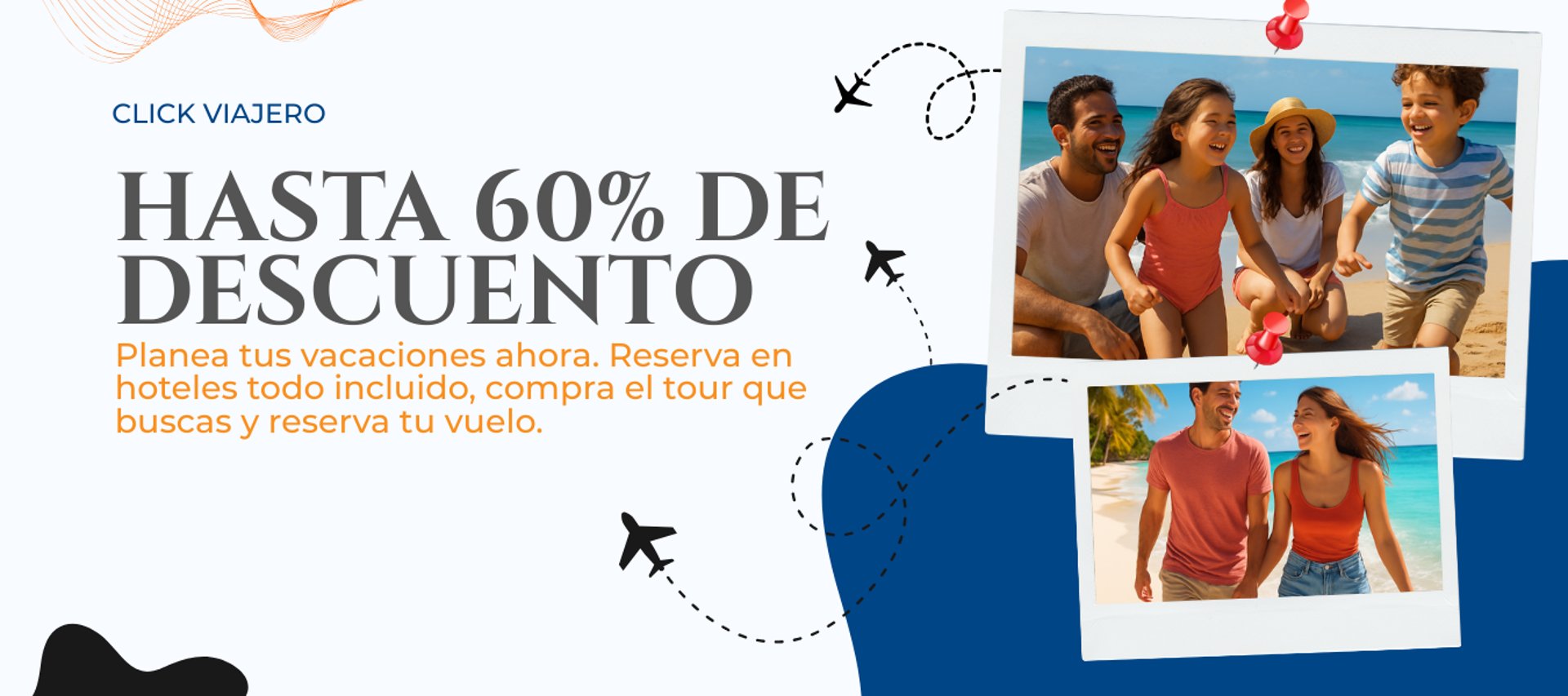 En ClickViajero, te ayudamos a encontrar las mejores ofertas en hoteles todo incluido, tours y vuelos para que tu viaje sea inolvidable y sin complicaciones.